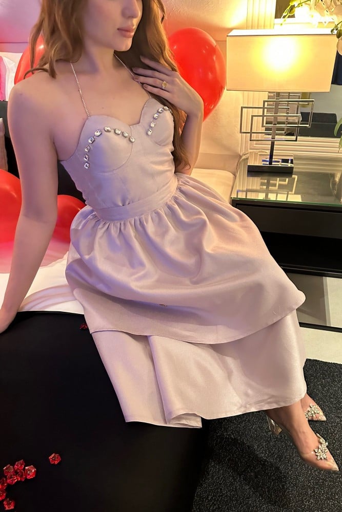 - توب بتصميم كورسيه مميز مع اضافة فصوص سوارفسكي براقة على الصدر لتزيد من فخامة التصميم